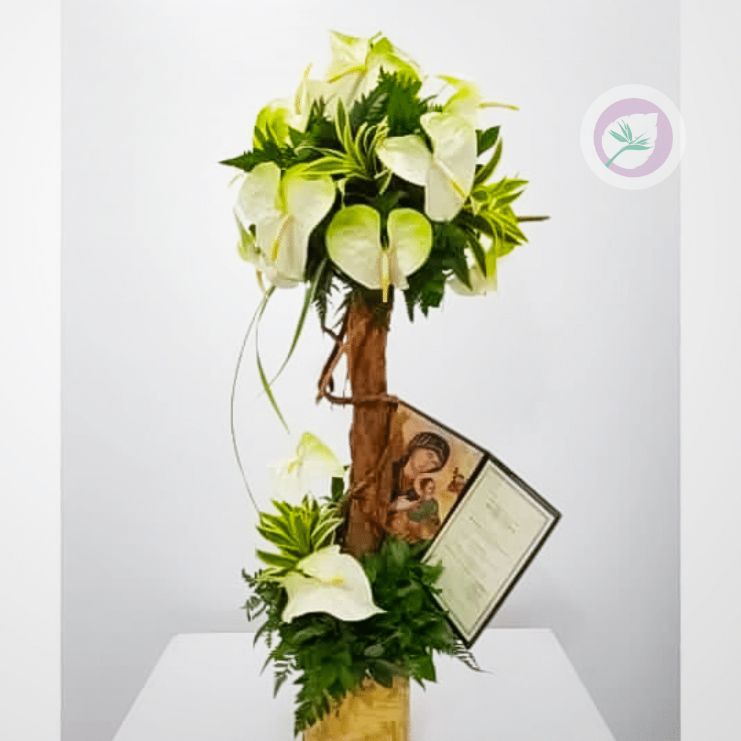Follaje: Helecho cuero, rusco, liriope y canciĂłn de la india.