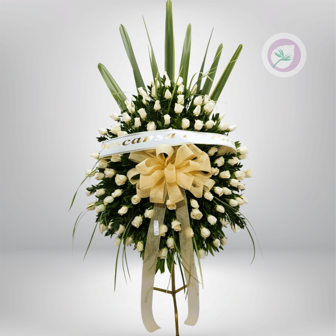Corona funebre de rosas blancas en pedestal para expresar condolencias y honrar la memoria de ese ser que ya se fué.
