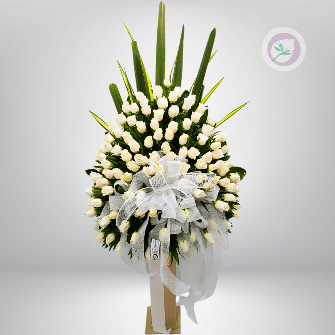 Corona funeraria para expresar condolencias, ideal para velorios o exequias – Ramo de flores funebres con rosas blancas.
