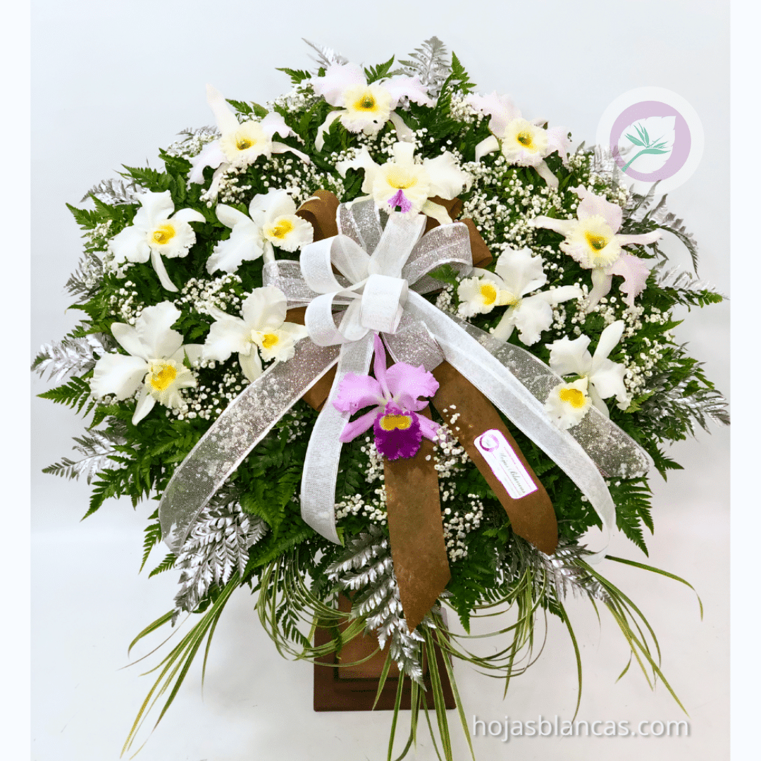 Coronas de flores fúnebre con orquídeas cattleyas para expresar condolencias.