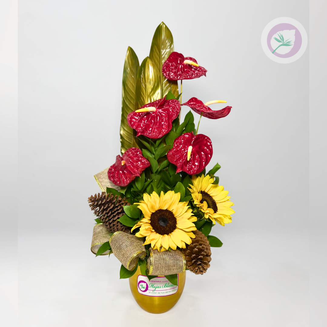Los Girasoles y Anturios navideños  de Floristería Hojas Blancas combina la alegría del sol con la elegancia de los Anturios. Cada arreglo está elaborado con flores frescas, acompañados de rusco, helecho y detalles decorativos como piñas de pino, moños y adornos navideños, cuidadosamente dispuestos en una base dorada que evoca elegancias y exclusividad