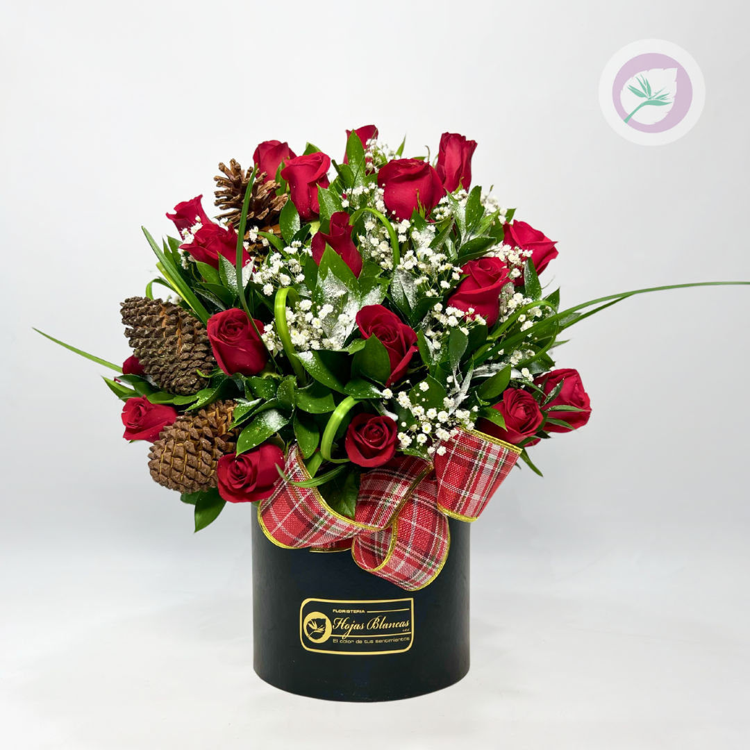 Las Rosas navideñas de Floristería Hojas Blancas combina la delicadeza y el lujo de las rosas y la calidez de la navidad. Cada arreglo está elaborado con flores frescas, acompañados de rusco, liriope y detalles decorativos como piñas de pino, moños y adornos navideños, cuidadosamente dispuestos en una caja flojar de lujo que evoca elegancias y exclusividad
