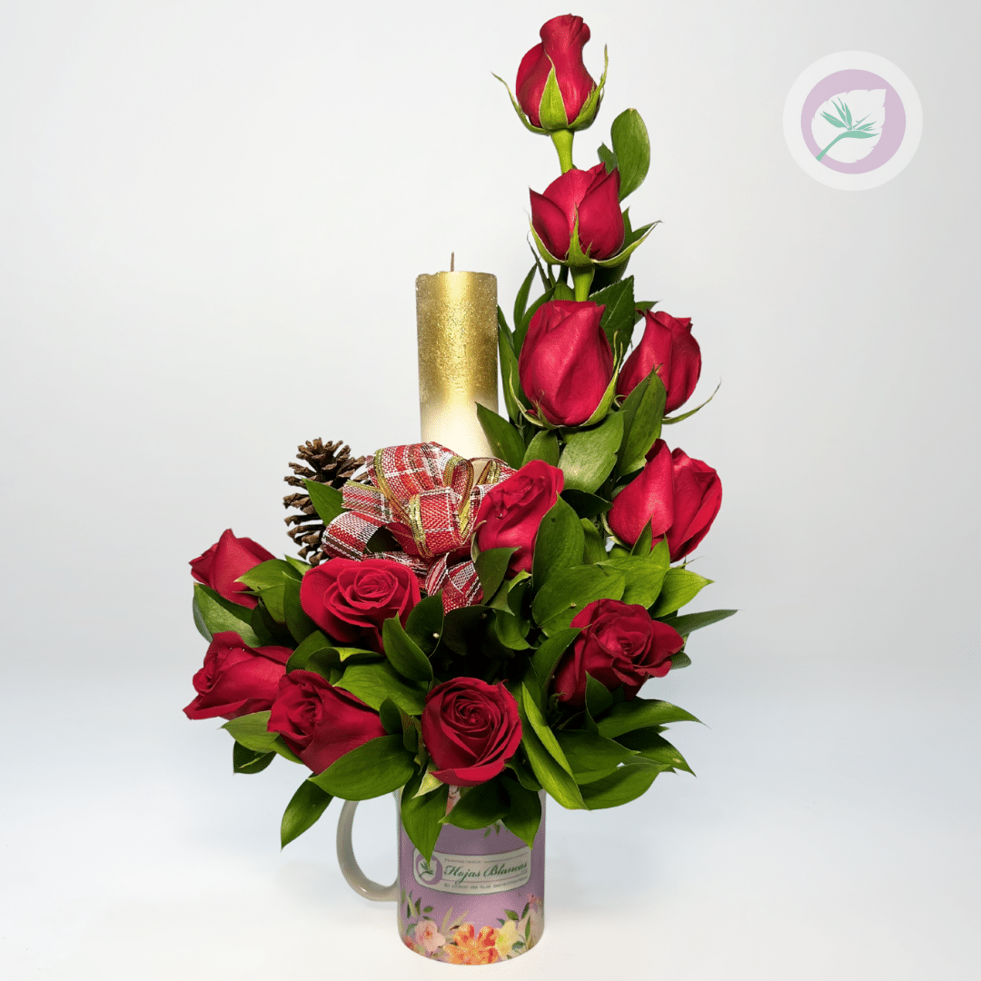 Regalo  para estas fiestas un hermoso mug con rosas y un velón para iluminar los propositos para el corazónTenemos los arreglos hermosos para tu persona especial en estas fechas tan significativas como la Navidad.